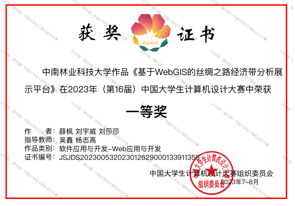 2023年7-8月,第16届中国大学生计算机设计大赛国赛分时段在全国6个赛区举行,中南林业科技大学荣获全国一等奖1项二等奖5项,三等奖9项理学院地理信息科学系本科生薛枫、刘宇威、刘莎莎同学完成的作品基于WebGIS的丝绸之路经济带分析展示平台”(指导教师:吴鑫杨志高)荣获全国一等奖。这是我校理学院学子实现该项赛事一等奖“零”的突破也是我们学校第二次获得全国一等奖