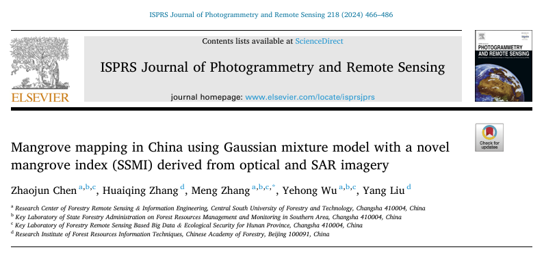 我院智慧林业团队在ISPRS Journal of Photogrammetry and Remote Sensing发表科研论文,发展了一种联合新型红树林指数(SSMI)和高斯混合模型(GMM)的红树林制图方法,该方法不需要训练样本,只需要利用同时间段的一张Sentinel-1和一张Sentinel-2便能自动、准确地绘制出红树林范围。通过中国6个和东南亚4个红树林典型区的试验,结果表明所构建的红树林遥感识别方法在不同时间和空间上具有较强的稳定性。