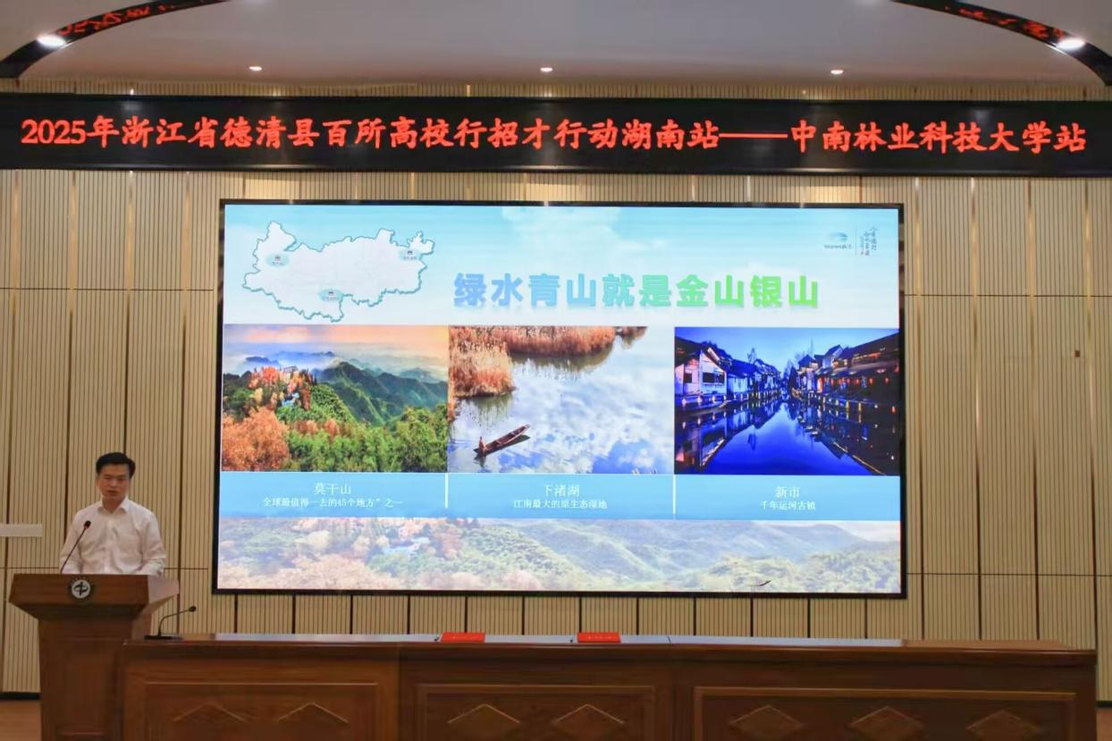 潘振华从历史人文、生态优势、产业布局三个维度全面介绍德清。他指出,这座拥有1800多年建县史的江南名城,既是“瓷之源、茶之地、竹之邦”,更是践行“绿水青山就是金山银山”理念的典范。他特别强调,德清正以国家新一代人工智能创新发展试验区、车联网先导区等“国字号”平台为依托,全力打造长三角人才创新高地,诚挚邀请中南林科大学子走进德清、扎根德清。