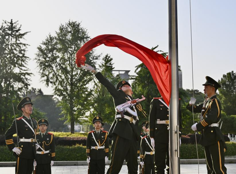 伴随着庄严的《义勇军进行曲》,五星红旗冉冉升起,在场全体师生肃立行注目礼,表达对祖国的无限热爱与崇高敬意。
